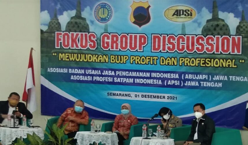 ABUJAPI | Semarang-- Guna mewujudkan profesionalisme Badan Usaha Jasa Pengamanan (BUJP) dalam mengelola satuan pengamanan (Satpam), Asosiasi Badan Usaha Jasa Pengamanan Indonesia (ABUJAPI) Jawa Tengah menggelar Fokus Group Discussion (FGD) di Gedung C ruang Rama Hotel UTC Semarang, pada Rabu (1/12/2021)